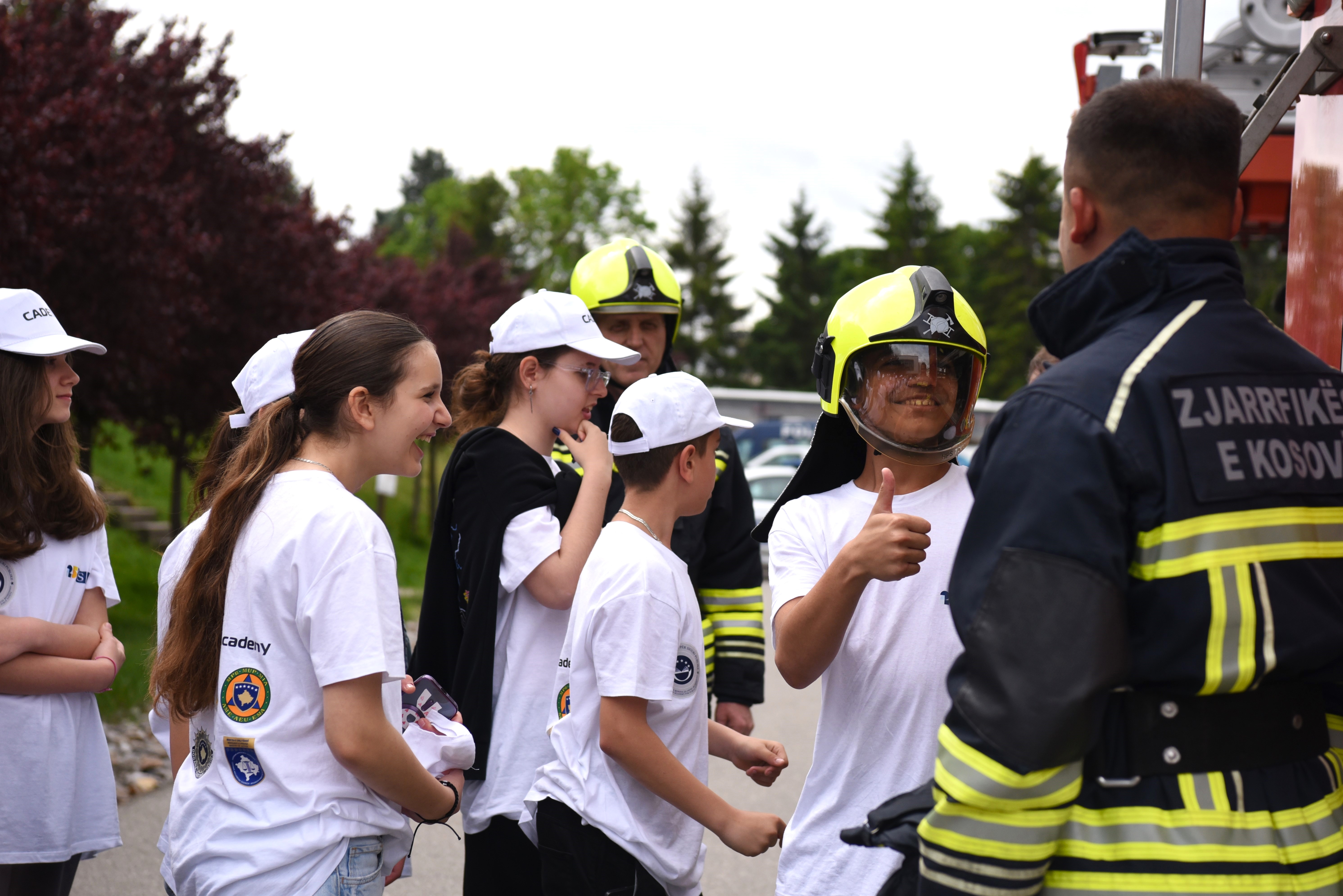 Nxënësit e entuziazmuar mbajnë helmetën e zjarrfikësve gjatë ushtrimit praktik, të gatshëm për veprim. Vushtrri, 8 maj 2025.(OSBE/Venla Aalto)
