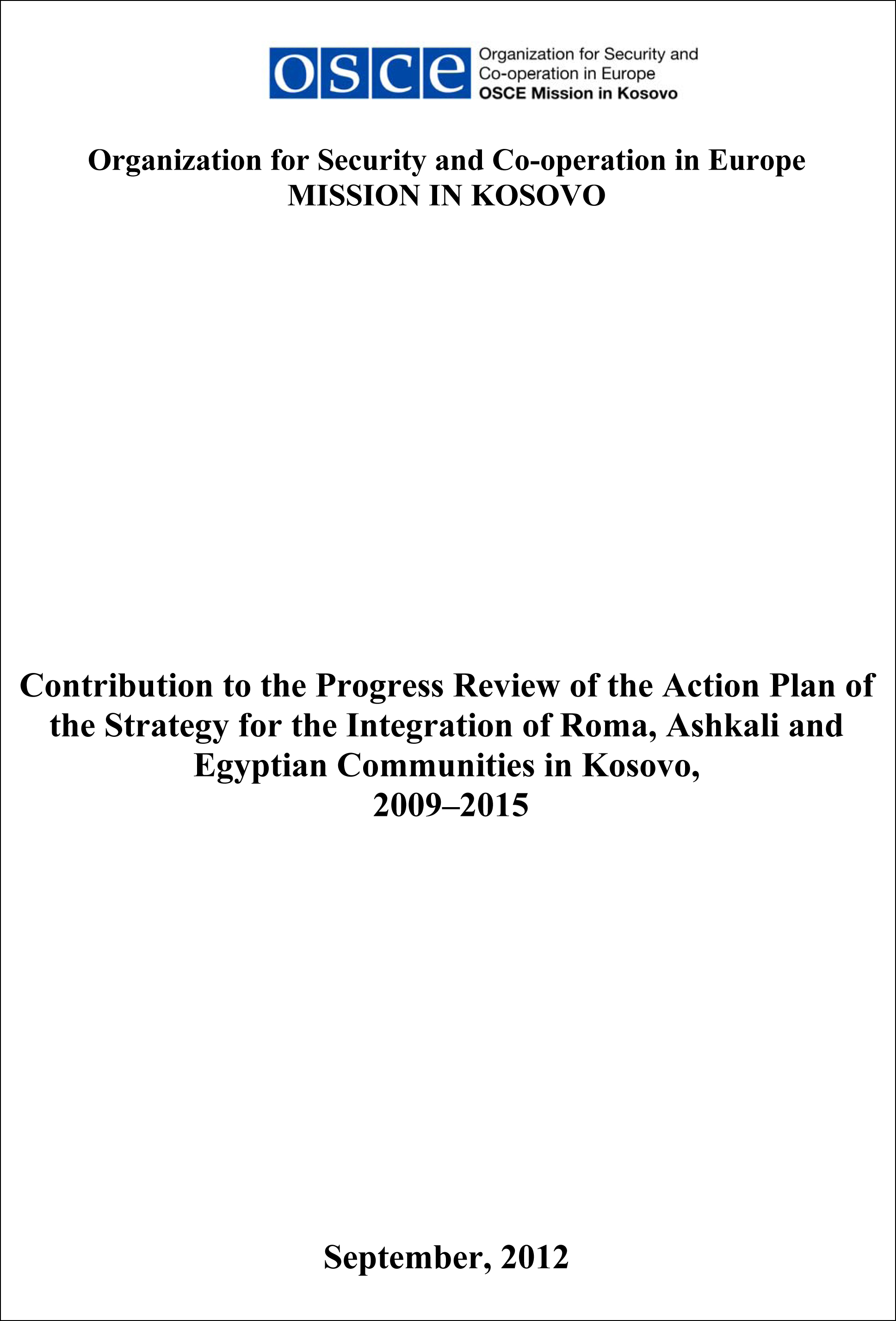 Cover for the document on the contribution to the progress review of the action plan of the strategy for the Integration of Roma, Ashkali and Egyptian Communities in Kosovo, 2009–2015.