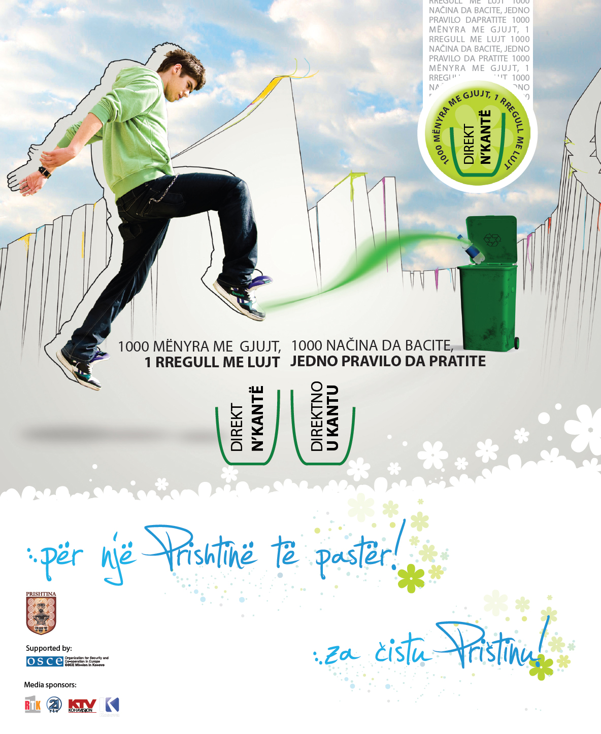 This newspaper campaign advertisement calls on the public to pay their garbage-collection bills with the message "1000 times to throw, one bill to pay: pay the garbage-collection bill." The slogan is "...for a clean Pristina!"