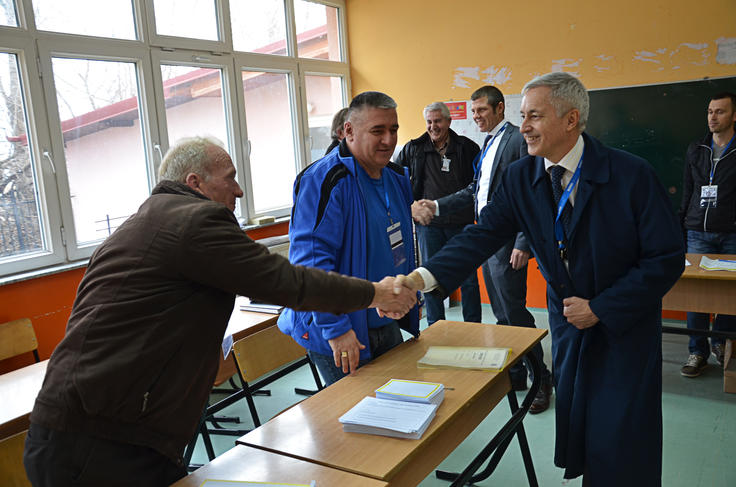 Head of the OSCE Mission in Kosovo, Ambassador Jean-Claude Schlumberger, greets polling station committee members in Mitrovica/Mitrovice North where repeat elections for mayor were facilitated by the OSCE on 23 February 2014.