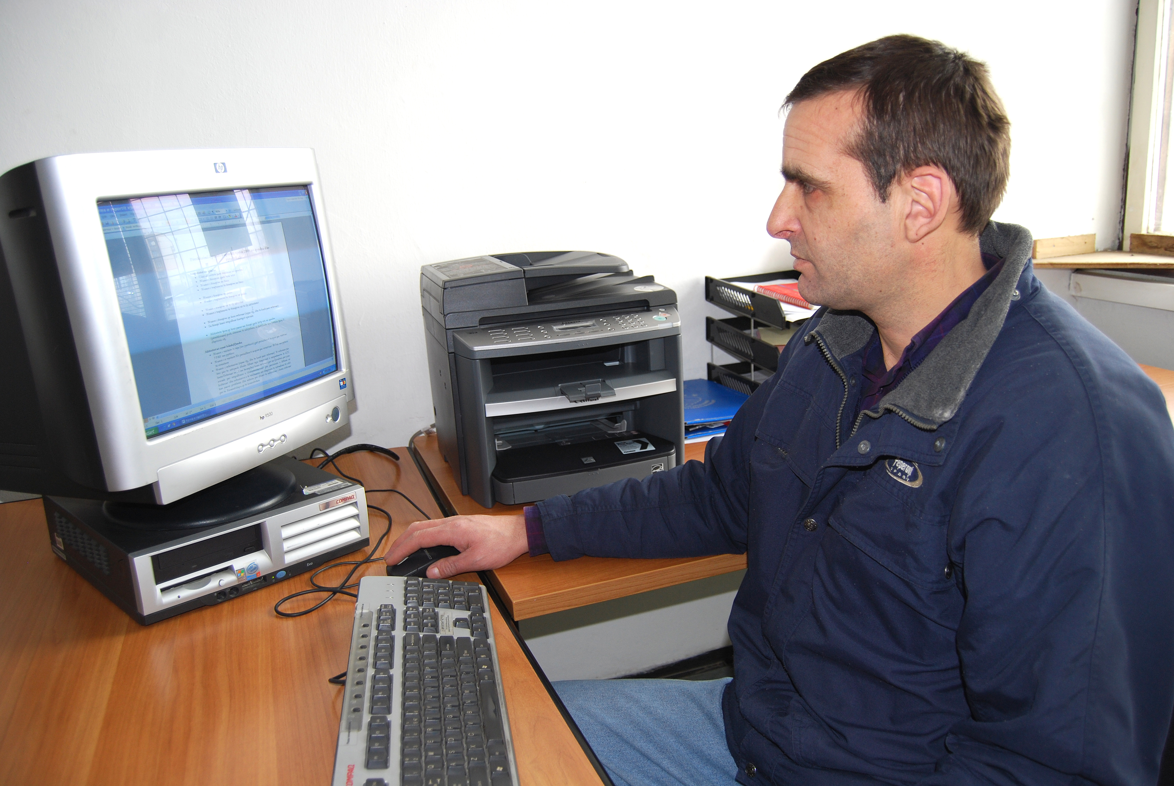 Agim Jashari, co-ordinator of the Handikos office in the municipality of Fushe Kosove/Kosovo Polje, working on a computer donated by the OSCE Mission to the new Handikos office within the municipal building, Fushe Kosove/Kosovo Polje, 4 February 2010.