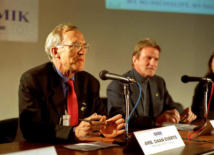 Former ambassador Daan Everts (left), Head of the OSCE Mission in Kosovo, congratulates the people of Kosovo for "passing the test of democracy with flying colours" at the press conference following the close of polls, Saturday 28, October 2000.