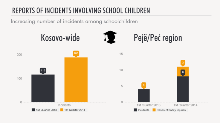 According to their data, a total of 45 incidents involving school children were reported to police in Pejë/Peć region in 2013. This figure doubled when comparing first quarters of 2013 and 2014, from 4 to 8 respectively, including three cases of bodily injuries. The numbers are sadly similar throughout Kosovo. The first quarter of 2013 saw 116 cases involving school children reported to police. This number rose to 188 for the same period of 2014.