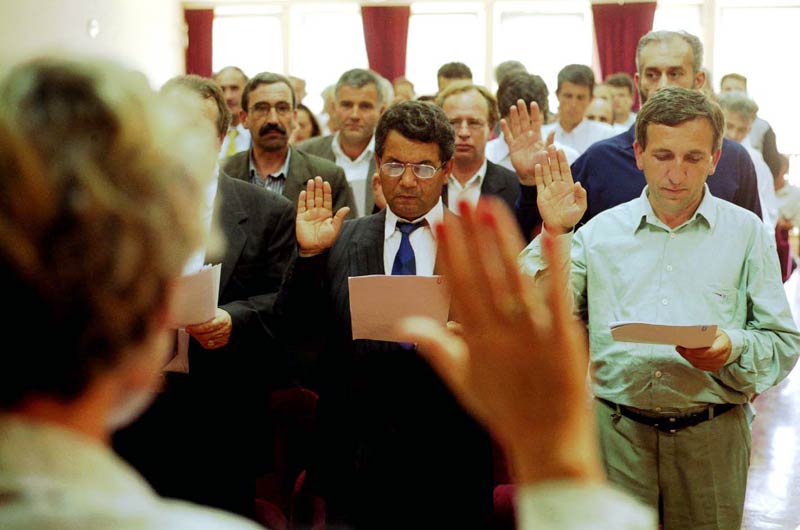 Archive image of judges in Kosovo sworn in under the auspices of the UN Civil Administration and the OSCE, 16 August 2000.