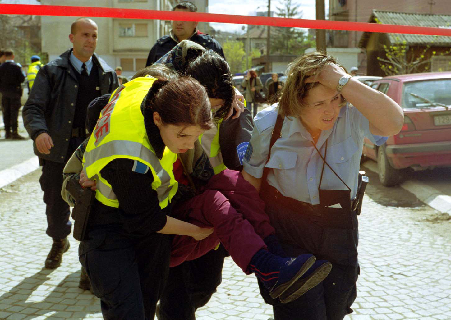 Kosovo Police Service officers assist the evacuation of local
