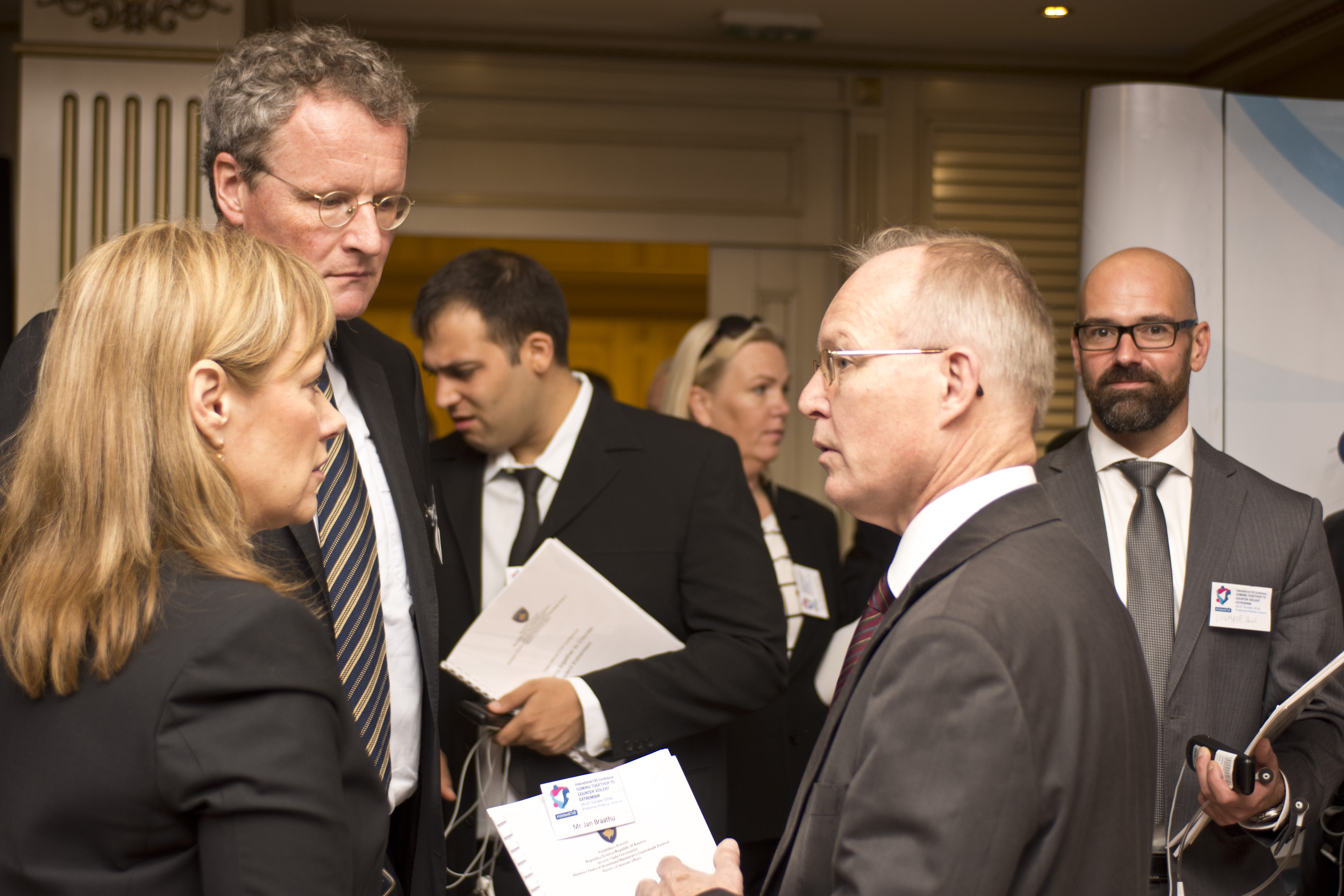 Head of the OSCE Mission in Kosovo, Jan Braathu speaks to counterparts from Skopje, Head of the OSCE Mission to Skopje, Nina Suomalainen and Head of the OSCE Presence in Albania, Bernd Borchardt ahead of the OSCE-supported conference on countering violent extremism, Prishtine/Pristina, 26 October 2016.