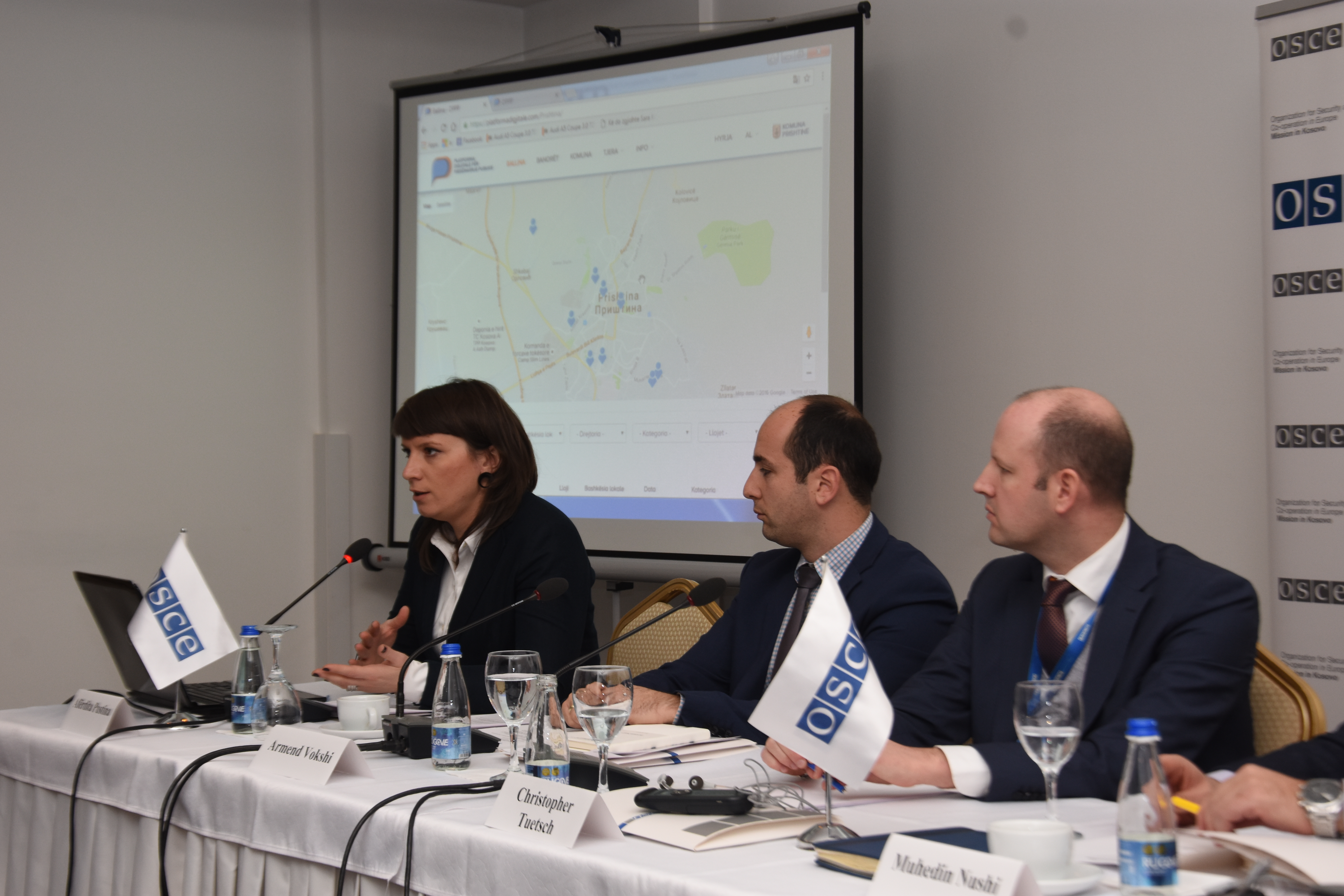 Aferdita Pustina (left) of the OSCE Mission in Kosovo, presenting an OSCE-supported Digital Platform for Public Participation at the Civil Society Forum, Prishtine/Pristina, 1 December 2016.