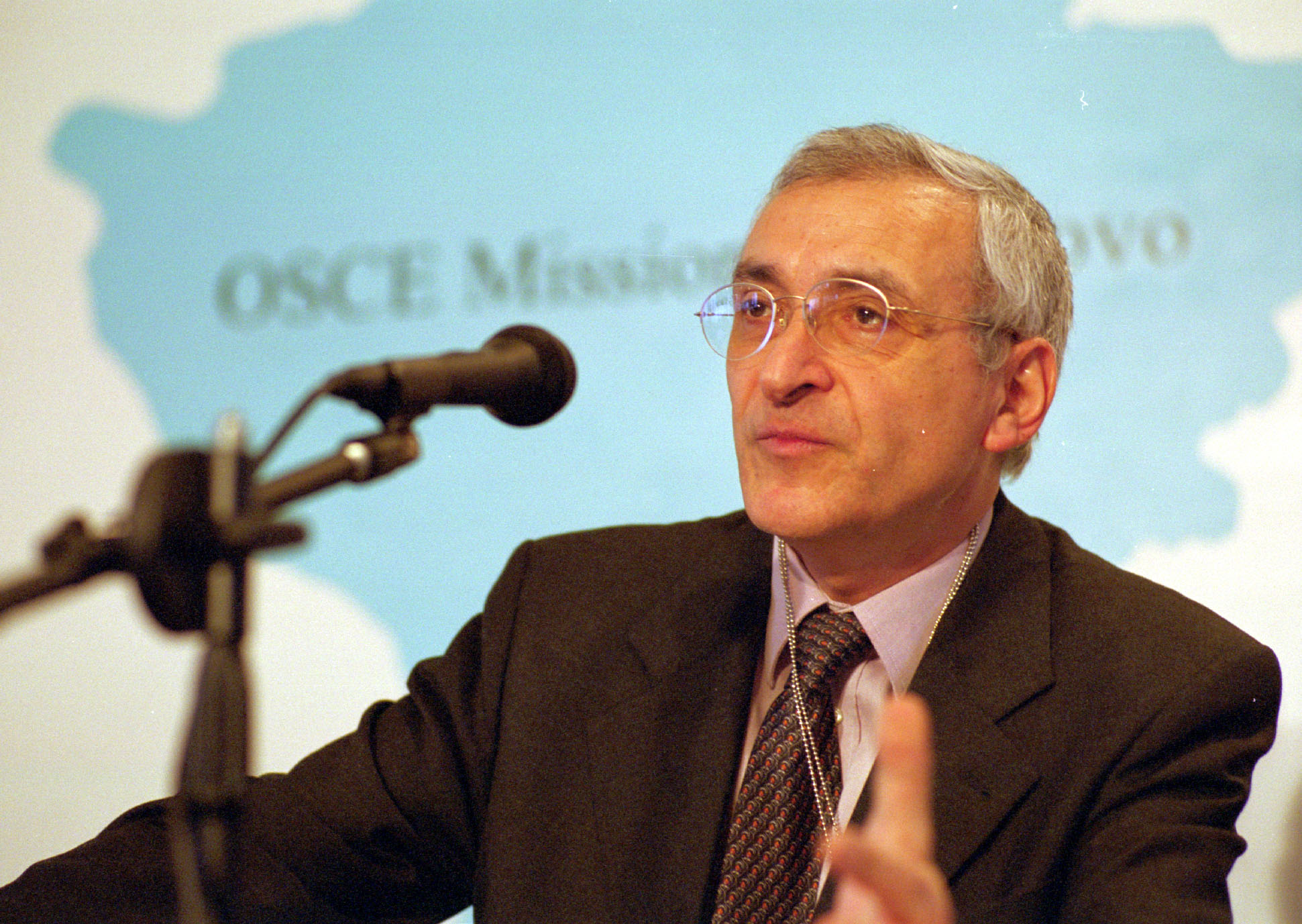 Head of the OSCE Mission in Kosovo, Pascal Fieschi of France, speaking at a press conference.