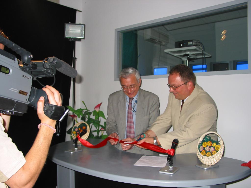 Head of the OSCE Mission in Kosovo Pascal Fieschi (left) opens Kosovo's new multi-ethnic media station, TV Herc, in Strpce/Shtërpce, 12 July 2004.