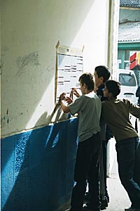 Youngsters in Prishtine/Pristina take an interest in a party candidates' list on Kosovo's Assembly Election day, 23 October 2004.
