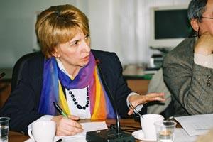 Gjylnaze Syla, head of the AAK-parliamentary group of the Kosovo Assembly, asks about the enhanced inspectorate programme in a discussion between Assembly members and the Kosovo Police Inspectorate (PIK) organized by the OSCE on March 1 2006.