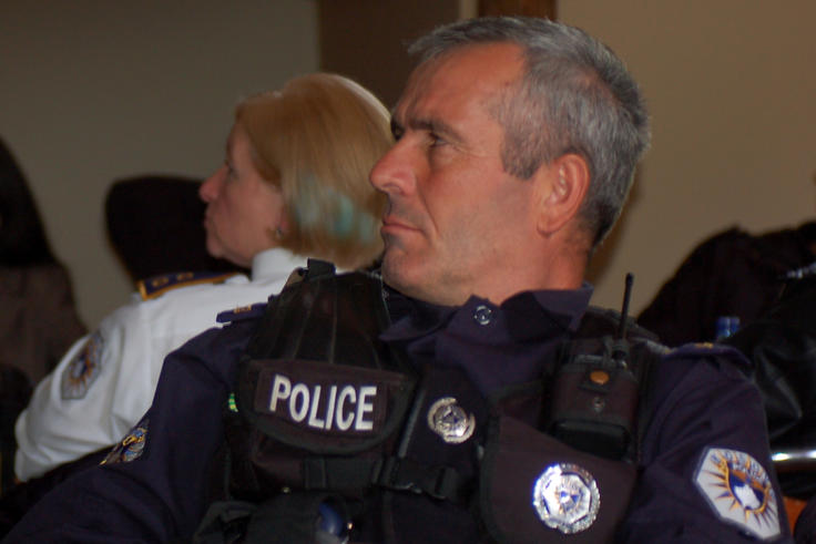 A member of the Kosovo border police at a training event in Prishtina/Pristina on how to effectively identify and refer foreign and local victims of trafficking to relevant institutions, May 2010.