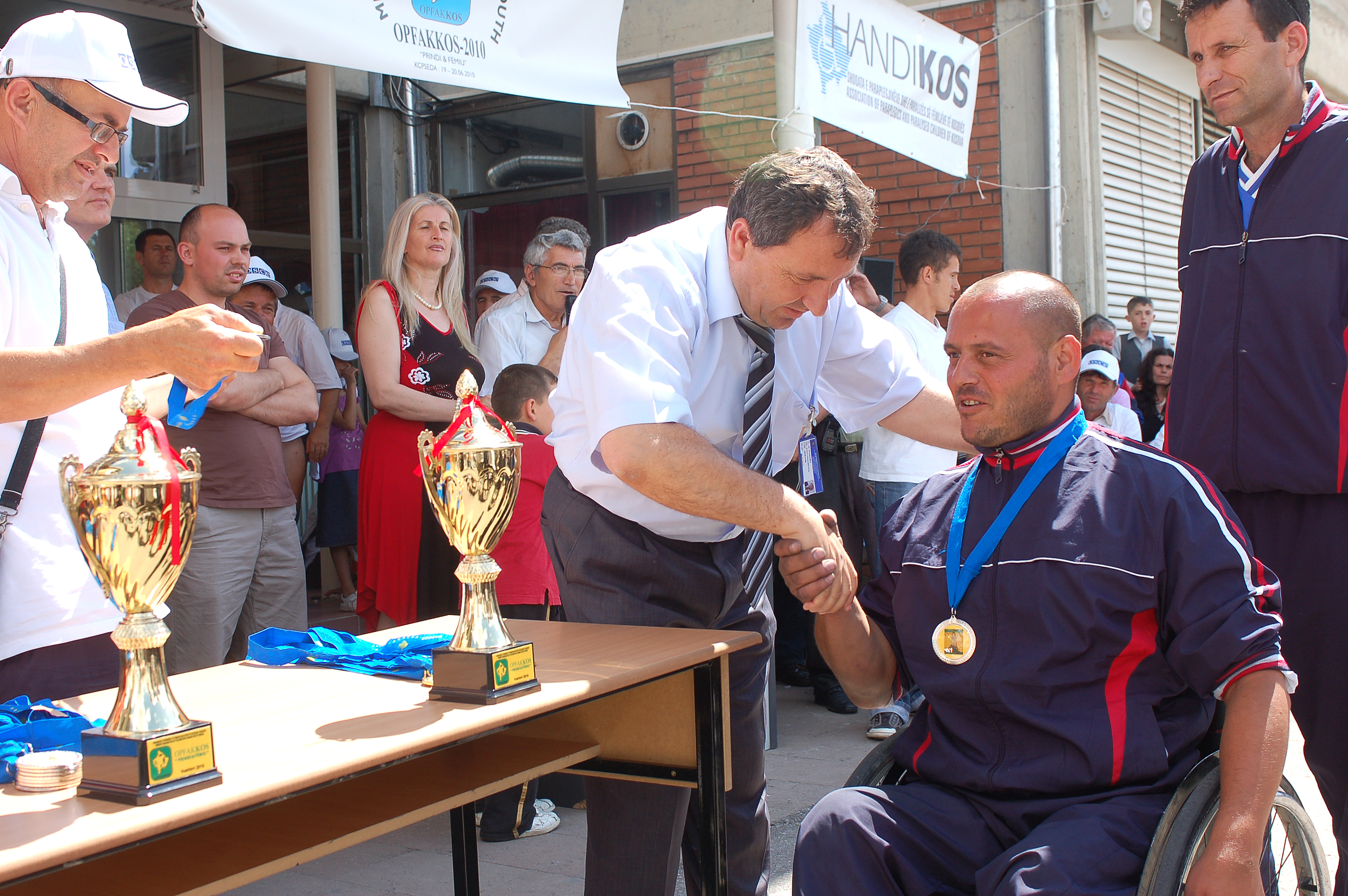 Ali Bajgora, director of the Kosovo Centre for Public Safety Education and Development (KCPSED), hands out medals to the participants of the mini Olympics for Disabled Youth, organized by the Mission, Vushtrri/Vucitrn, 18 June 2010.
