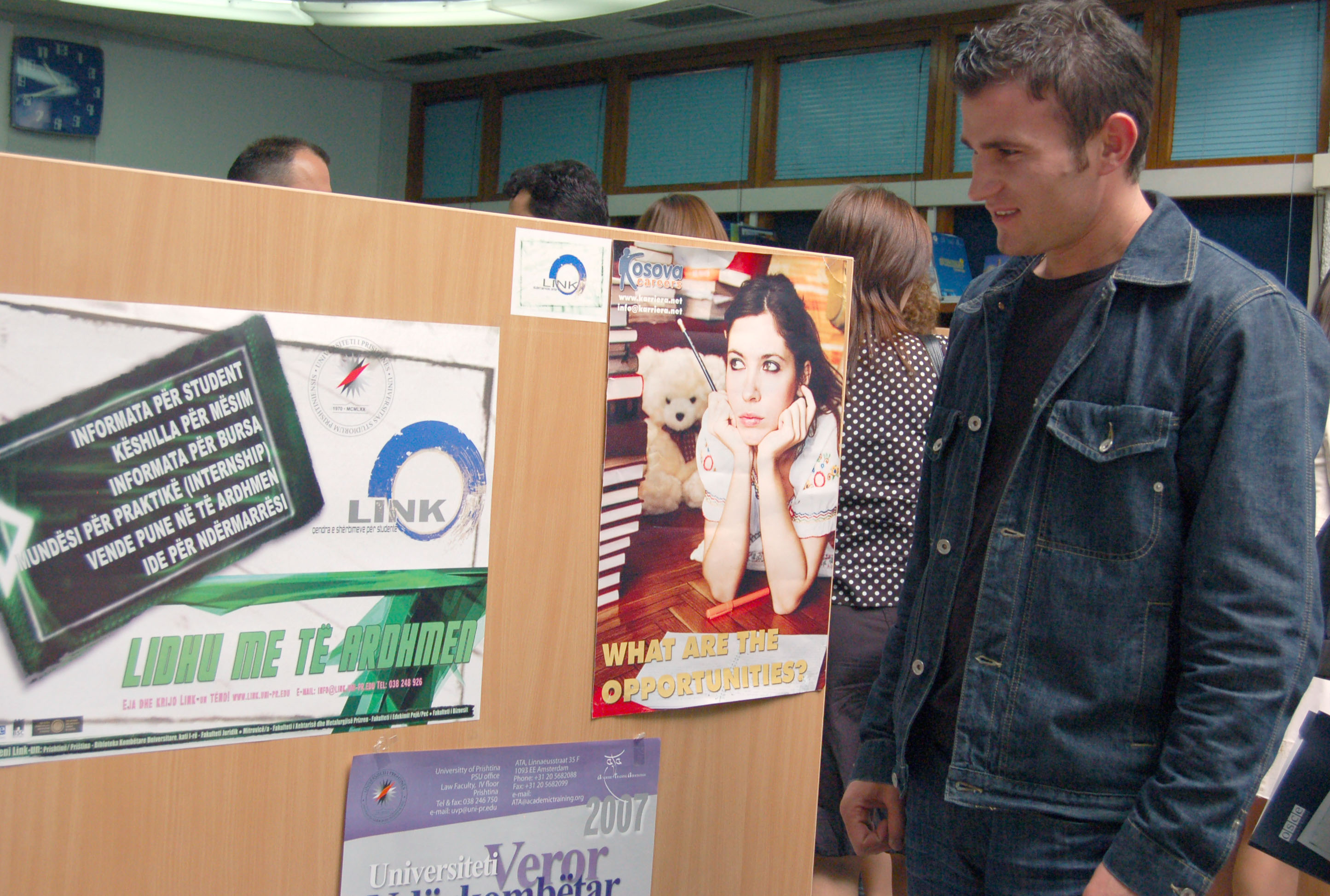 One of the students looking at the banner of the Student Center-"Link", after the official opening of the center. The center is supported by the OSCE Mission in Kosovo, Prishtine/Pristina, 24 April, 2007