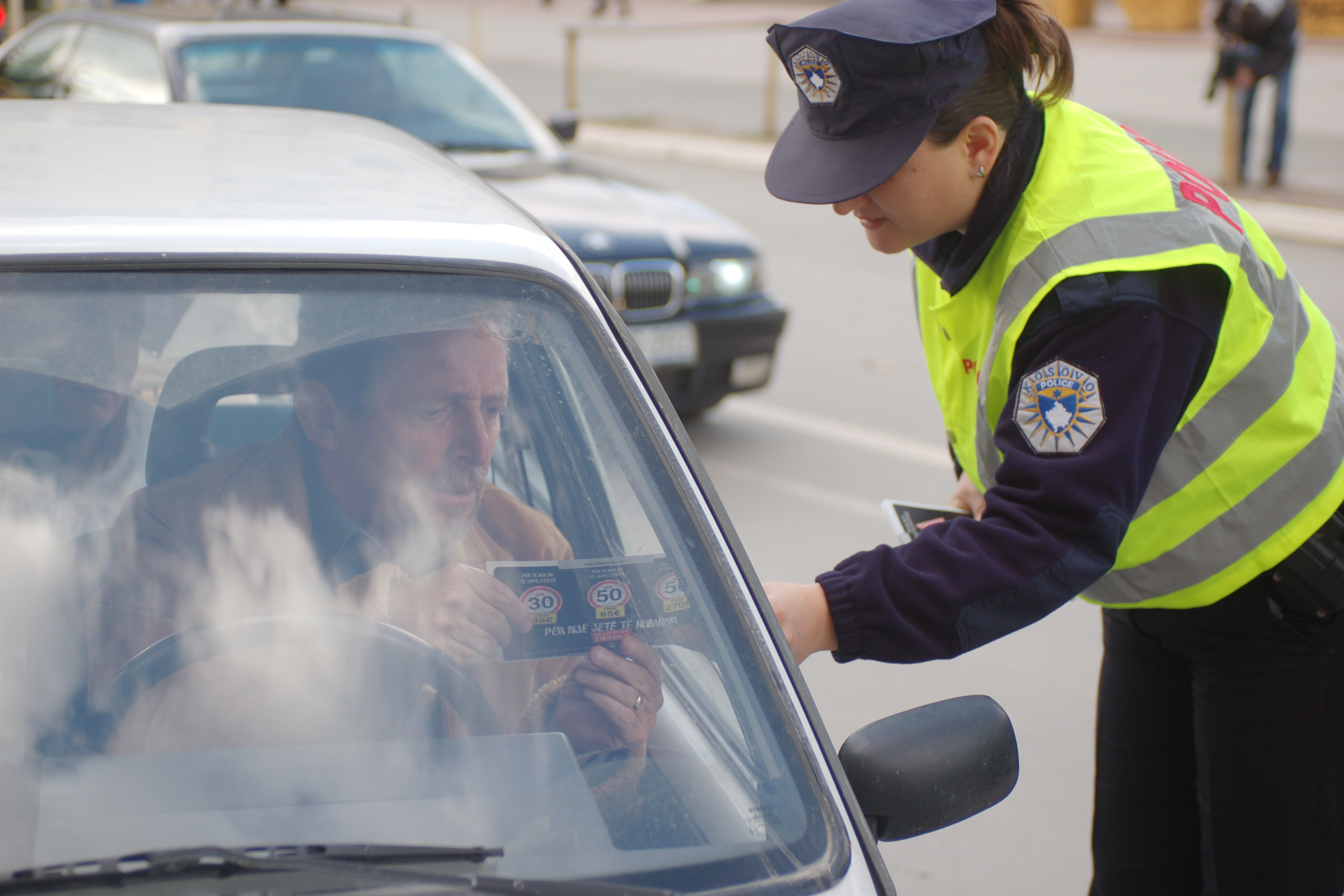 A Kosovan police officer distributes leaflets on the launch day of an OSCE campaign on traffic safety, Prishtine/Pristina, 8 October 2010.