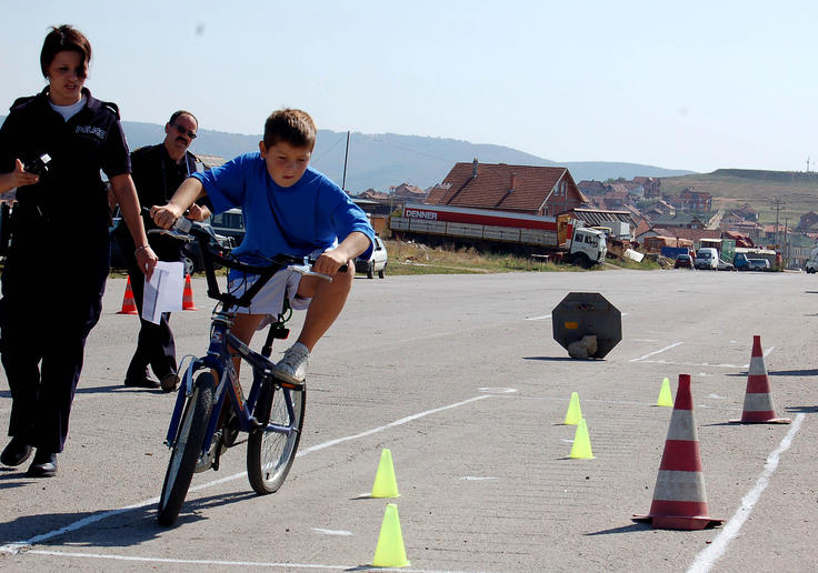 A schoolboy demonstrates his skills in riding a bike through obstacles at an OSCE workshop on child safety, as part of a project on community policing, Gjilan/Gnjilane, 18 September 2007.