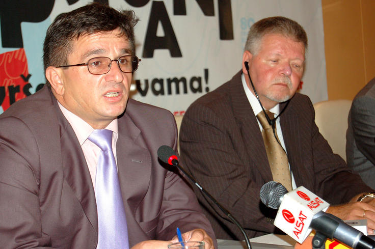 Hasan Preteni, Anti-Corruption Agency Director, and Markku Laamanen, Deputy Head of the OSCE Mission in Kosovo at the launch of the second phase of the Anti-Corruption Campaign, Prishtine/Pristina, 3 September 2007.
