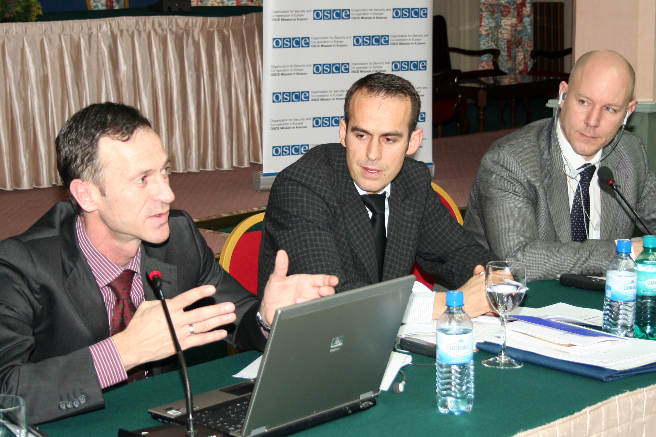 Besnik Osmani (r) and Agron Maxhuni (c) from the Ministry of Local Government Administration, together with Jan Lueneberg, the chief of the OSCE Mission in Kosovo's local governance section, at a workshop on improving the quality of municipal acts in Ohrid, Former Yugoslav Republic of Macedonia, 1 March 2011.