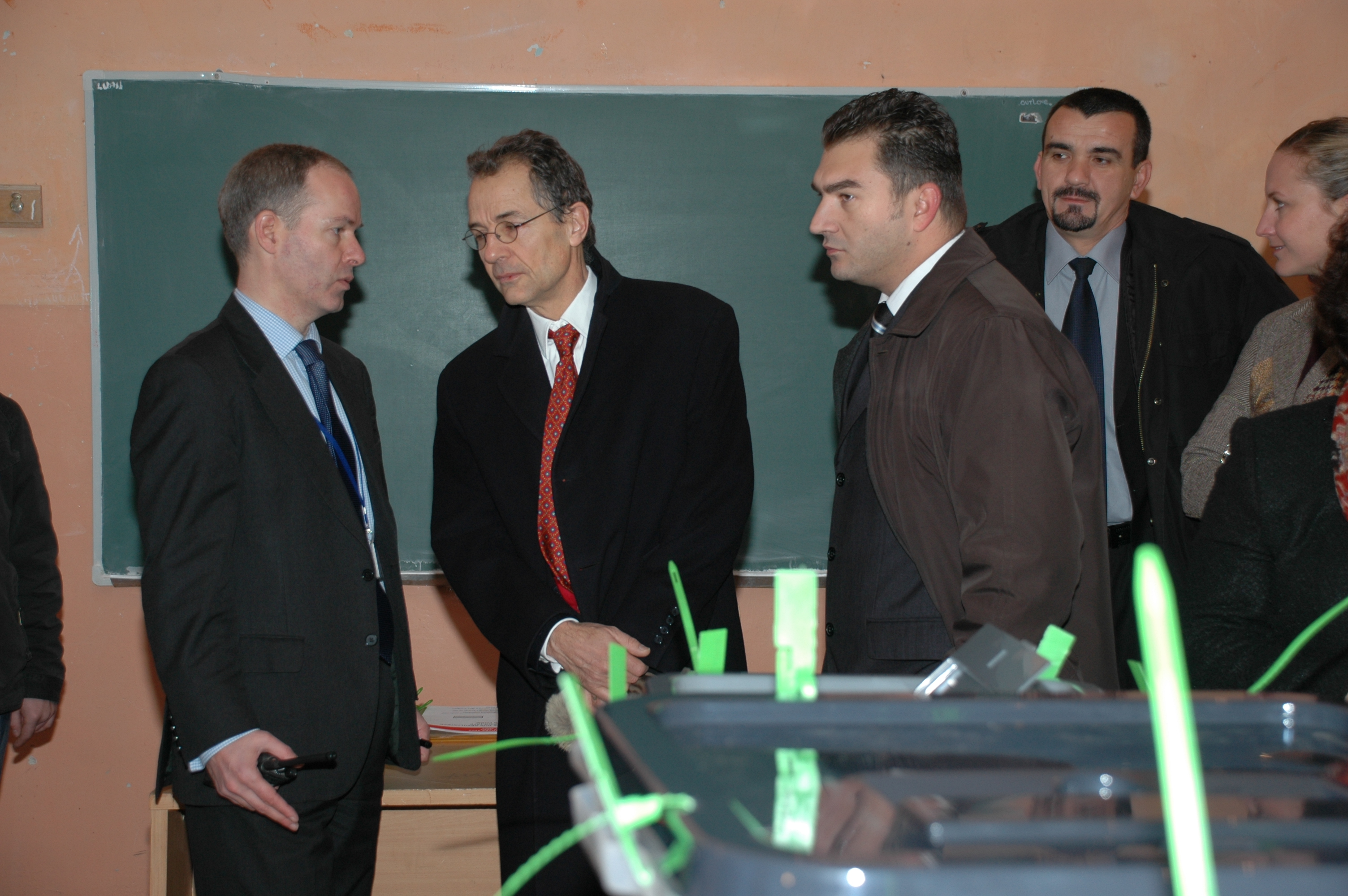 Hugh Fulton (left), the Mission in Kosovo's Elections Director, briefs Mission Head, Ambassador Tim Guldimann (centre), at 7:00 am on election day, 17 November 2007. Photo taken at "Sami Frashi" secondary school polling station, Pristina.