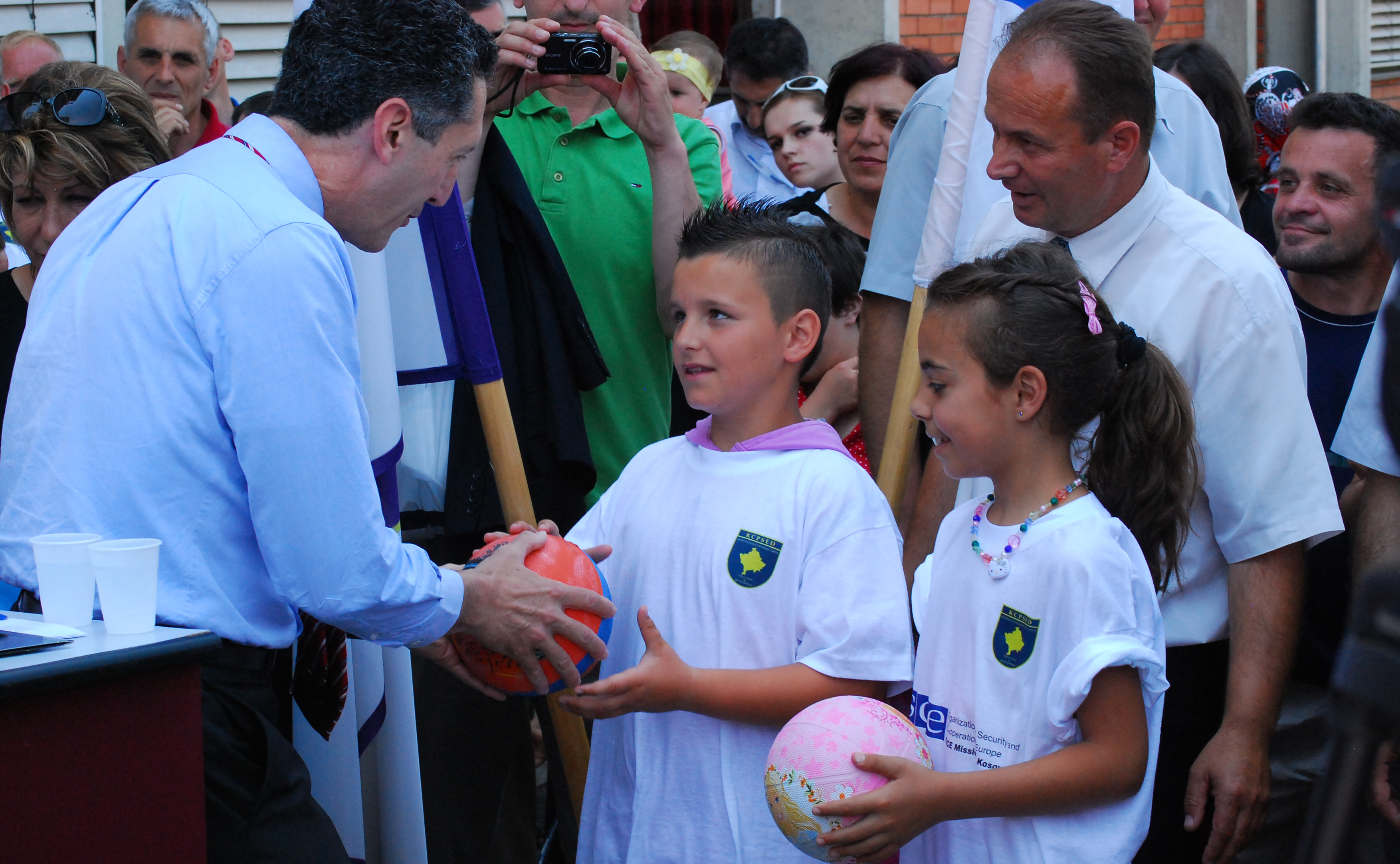 Edward Joseph, Deputy Head of the OSCE Mission speaks to children participating in the ‘Mini Olympic Games’ organised by the OSCE Mission in Kosovo in co-operation with the Kosovo Centre for Public Safety, Education and Development, Vushtrri/Vučitrn, 18 June 2011.