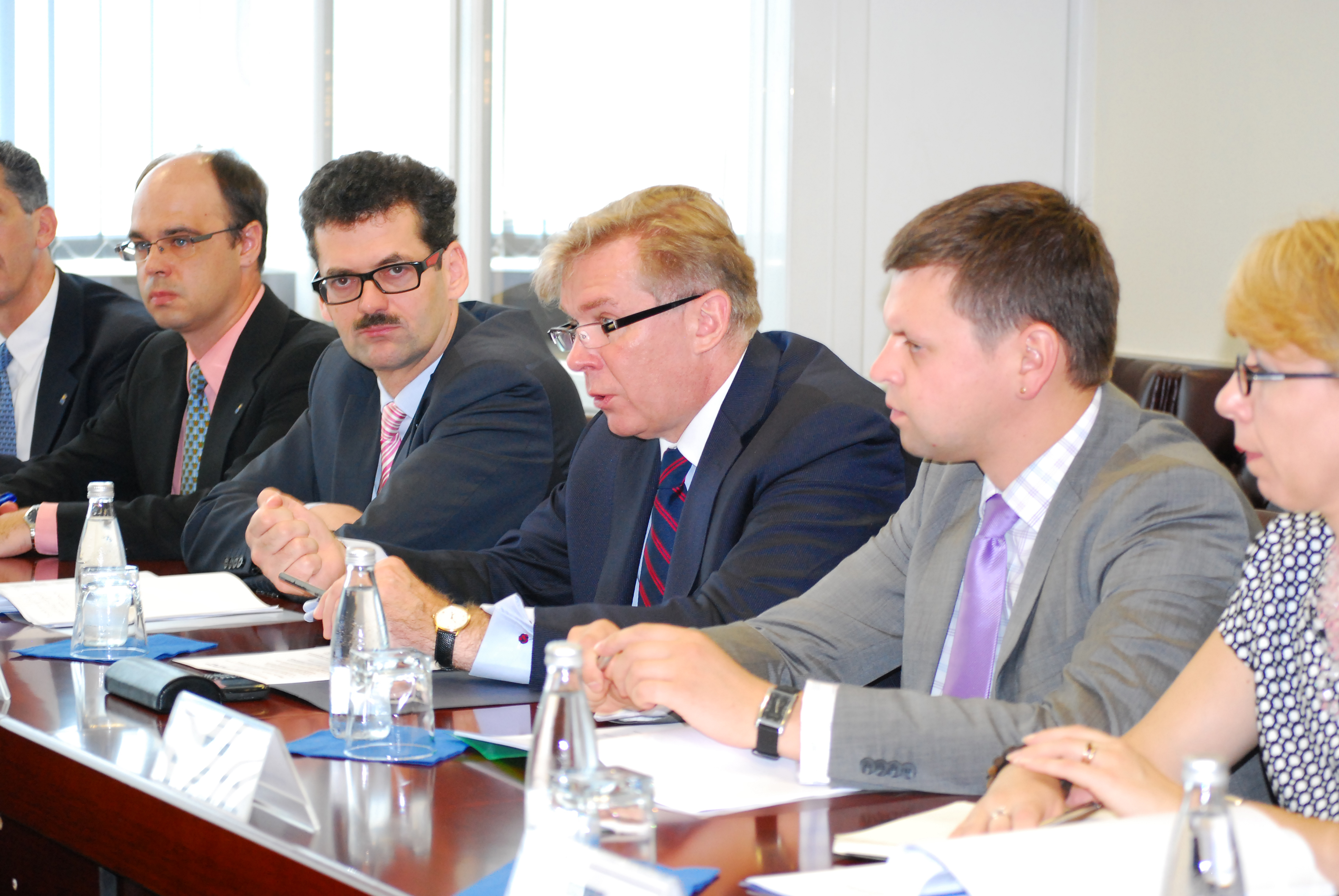The OSCE Chairperson-in-Office, Lithuanian Foreign Minister Audronius Ažubalis (c) and his team at a meeting with Kosovo’s Deputy Prime Minister Hajredin Kuqi during a visit to Kosovo, Prishtinë/Priština, 8 July 2011.