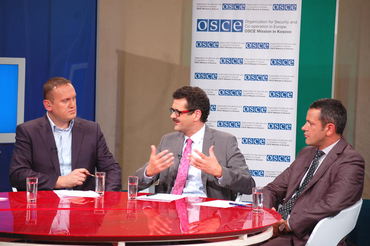 The Head of the OSCE Mission in Kosovo Ambassador Werner Almhofer (c), during a TV debate for Radio Television of Kosovo, discussing the current role of youth in democratic institutions—as part of International Democracy Day events organized by the Mission throughout Kosovo, Prishtinë/Priština, 13 September 2011.