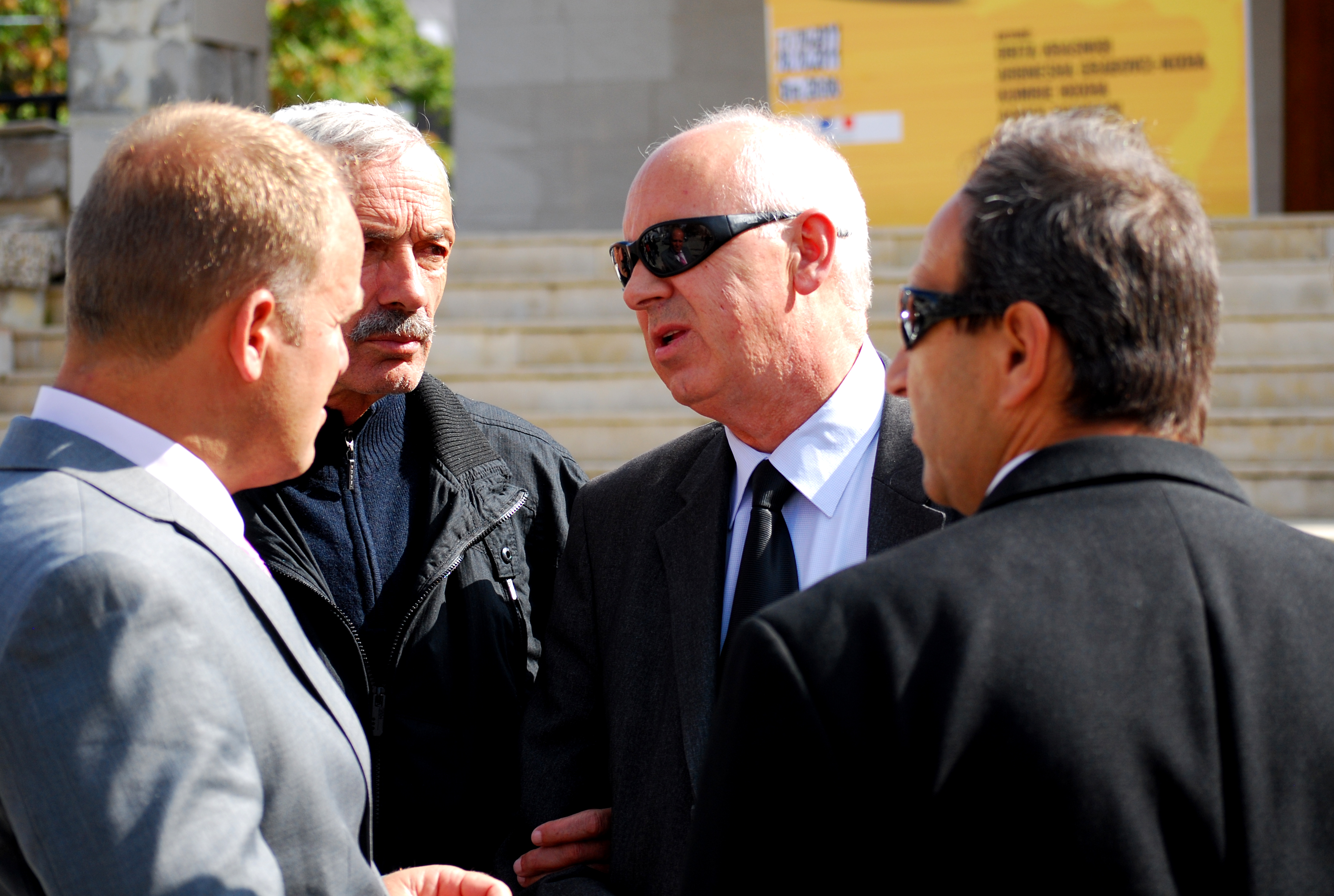 President of the Kosovo Association of Blind and Visually Impaired Persons Mexhit Foniqi (c), speaks to the director of the Health Directorate of Prishtinë/Priština municipality Valon Krasniqi (l), after a Mission-organised ‘Blind Parade’ in Prishtinë/Priština, 12 October 2011.