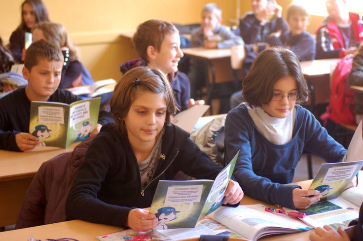 Pupils at Faik Konica primary school in Prishtinë/Priština read the safety handbook for schoolchildren and their parents, developed and published by the OSCE Mission in Kosovo and the Kosovo police, Prishtinë/Priština, 18 October 2011.
