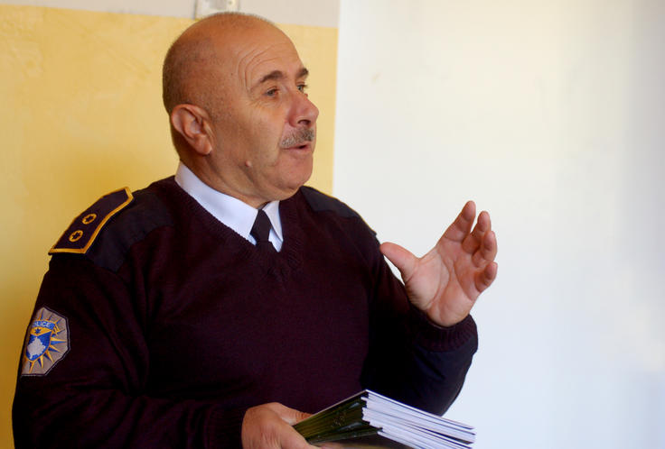Kosovo police officer Salih Dragidella, explains to pupils of Faik Konica primary school in Prishtinë/Priština the aim of the safety handbook for schoolchildren and their parents, developed and published by the OSCE Mission in Kosovo and the Kosovo police, Prishtinë/Priština, 18 October 2011.
