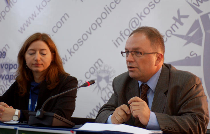 Duško Zavišić (r), the Deputy Director of the OSCE Mission's Security and Public Safety Department, speaks at a press conference to present a safety handbook for schoolchildren and their parents organised by the OSCE Mission in Kosovo and the Kosovo police, Prishtinë/Priština, 18 October 2011.
