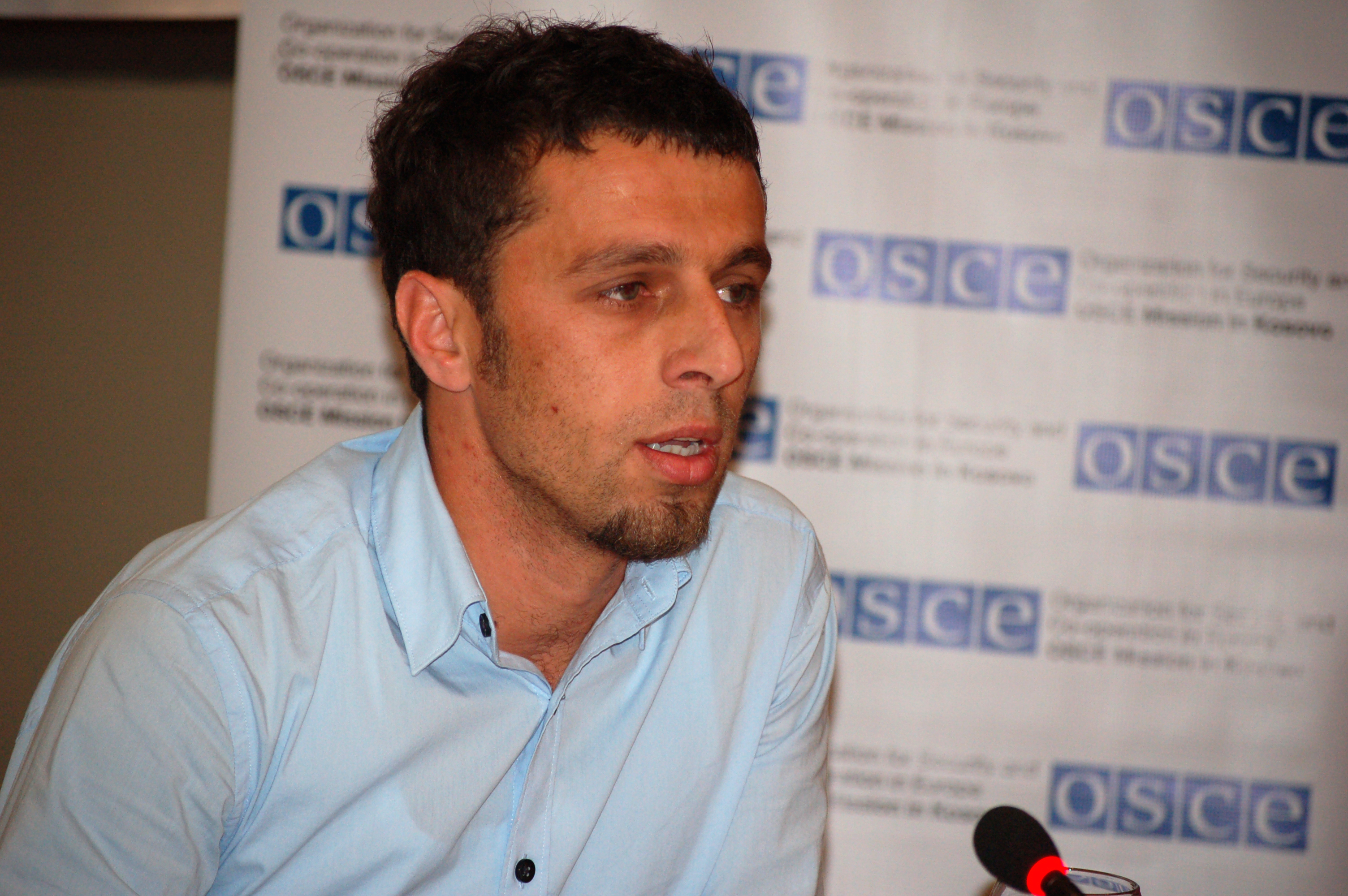 Arsim Lani, Deputy Chairperson of the Association of Professional Journalists of Kosovo, speaks at an OSCE-organized regional conference on investigative journalism, Prishtinë/Priština, 22 October 2011.