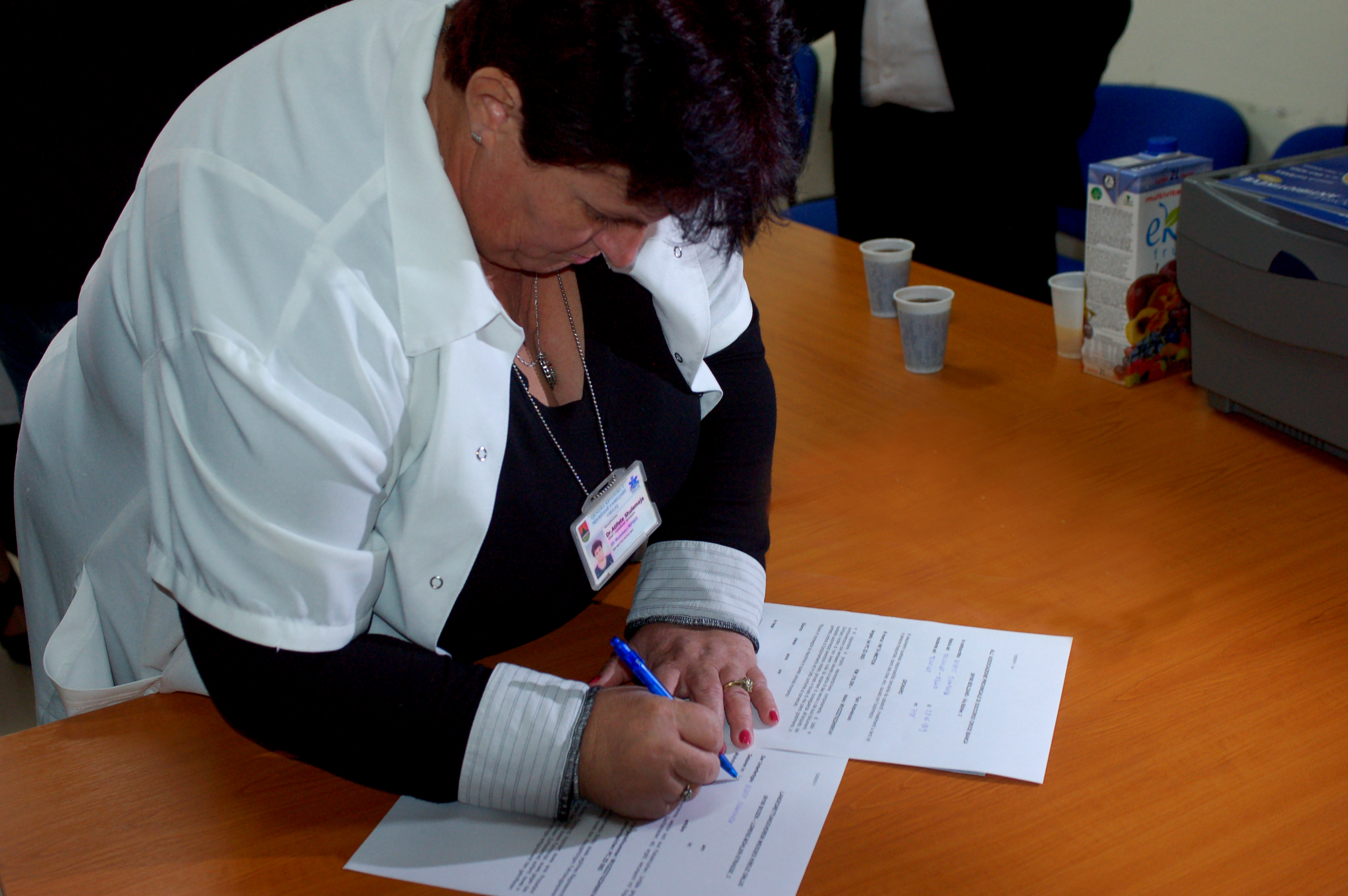 Director of Family Health Care Centre Atiffete Shulemaja signs the handover document for a donated ambulance and other medical equipment by the Association Weisse Kreuz/Croce Bianca (Italy), supported by the OSCE Mission in Kosovo, Obiliq/Obilic, 24 October 2011.