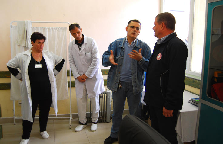 Nebi Shehu, a doctor from the Family Health Care Centre in Obiliq/Obilic, explains their working conditions to Franz Volgger, the Head of the Naturns/Naturno Section of the Weisse Kreuz/Croce Bianca (Italy), at a donation ceremony supported by the OSCE Mission in Kosovo, Obiliq/Obilic 24 October 2011.