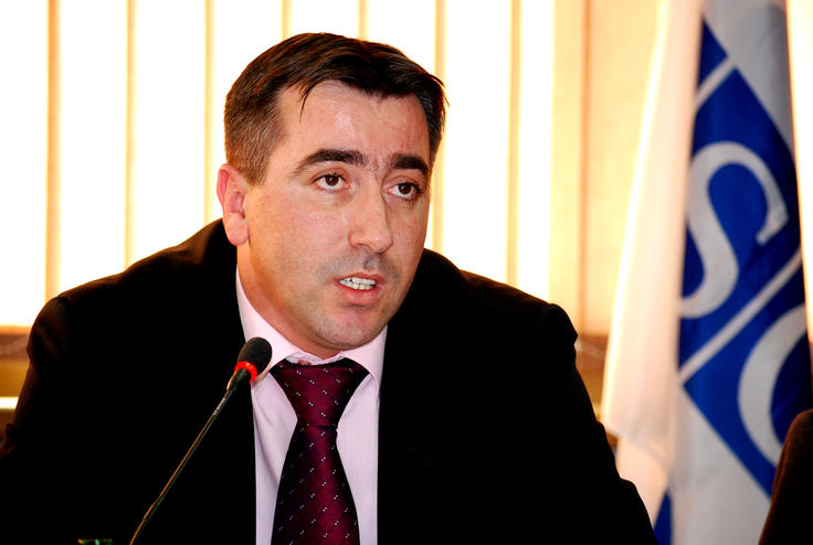 Sazan Ibrahimi, Executive Director of the Association of Kosovo Municipalities, speaks at the release of an OSCE report on division of responsibilities between central and local government, Prishtine/Pristina, 21 February 2008.