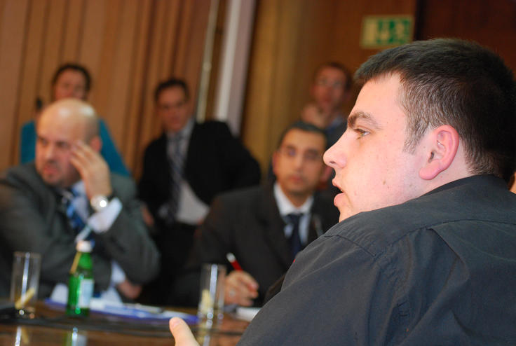 Radio Television of Kosova journalist Artan Haracia asks a question at the release of an OSCE report on division of responsibilities between central and local government, Prishtine/Pristina, 21 February 2008.
