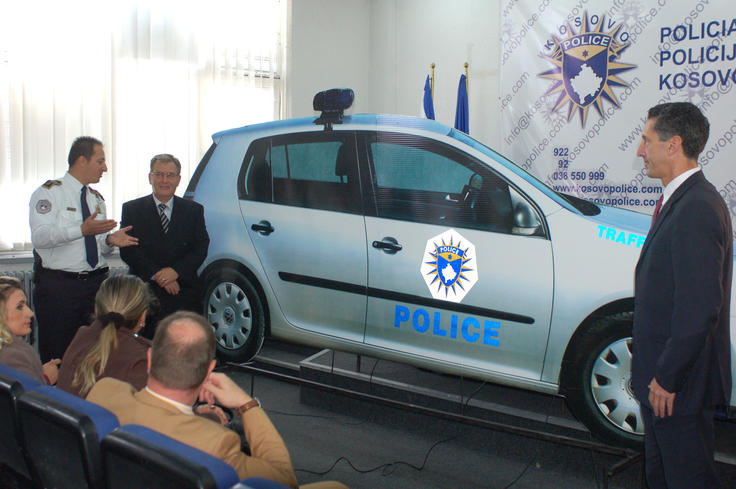 The Deputy Head of the OSCE Mission in Kosovo, Edward Joseph (r), and a Kosovo police representative present one of the six mobile Kosovo police car cut-outs to the media,at the launch of a traffic safety campaign organised by the OSCE Mission, in co-operation with Kosovo police, Prishtine/Pristina, 26 October 2011.
