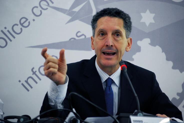 Deputy Head of the OSCE Mission in Kosovo, Edward Joseph, speaks at a Mission-organized press conference on promoting a new community policing methodology, Prishtinë/Priština, 14 December 2011.