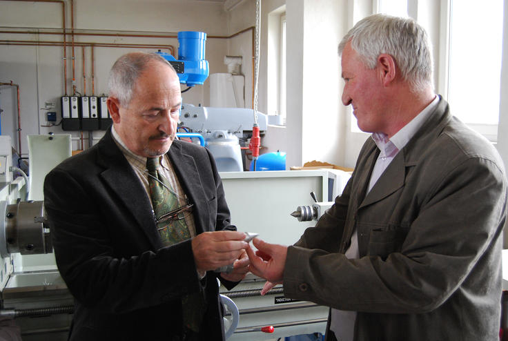 Remzi Bytyqi (right), Principal of Skender Laurasi secondary school in Suhareke/Suva Reka municipality, shows the Head of the OSCE Mission in Kosovo's regional office in Prizren, Lorenzo Gasca-Allue, products made by students, 25 April 2008.