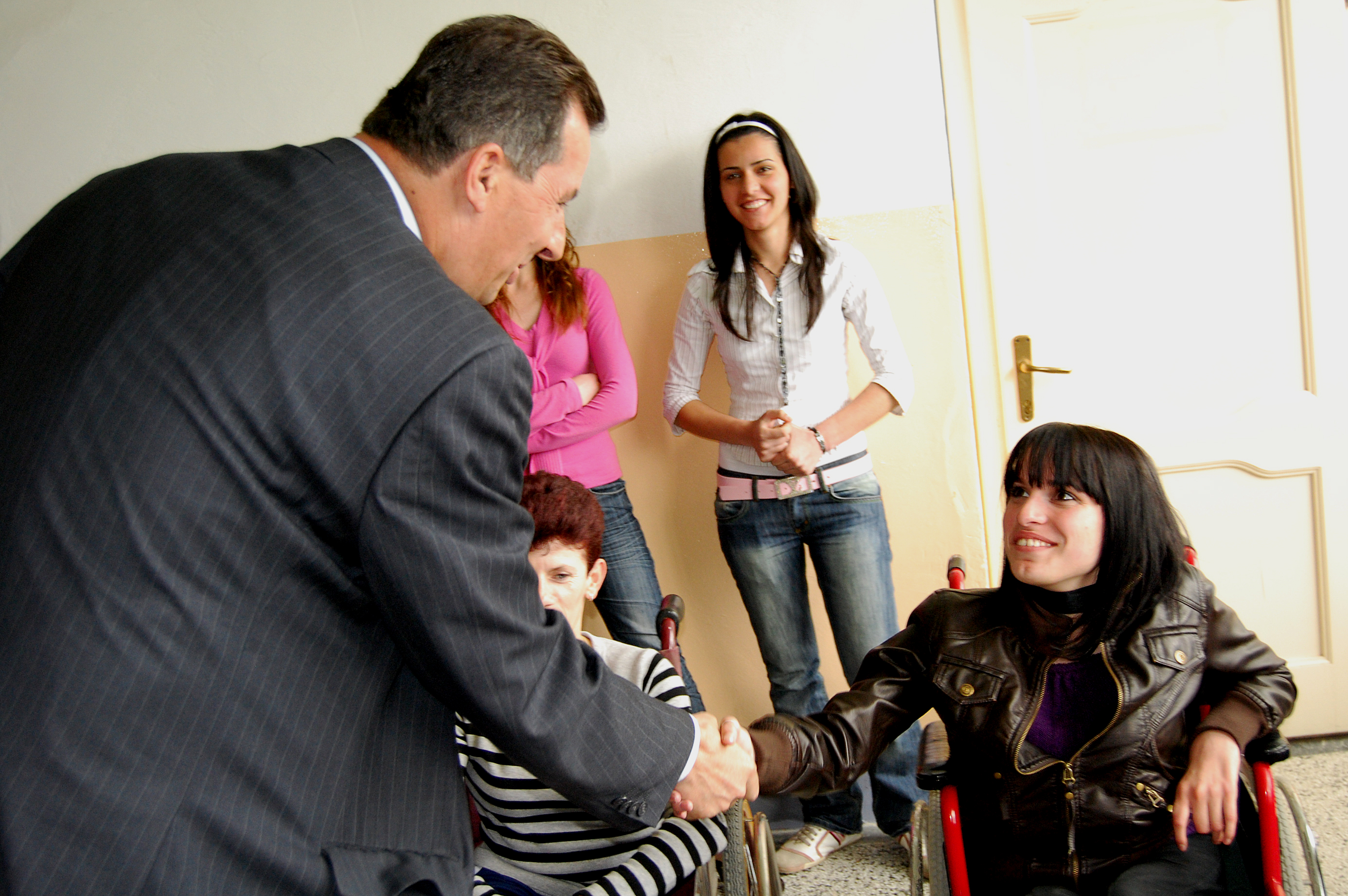 Sali Asllanaj, Mayor of Suhareke/Suva Reka municipality, shakes hands with a disabled student from Skender Laurasi secondary school at the launch of an OSCE Mission in Kosovo project for children with disabilities, 25 April 2008.