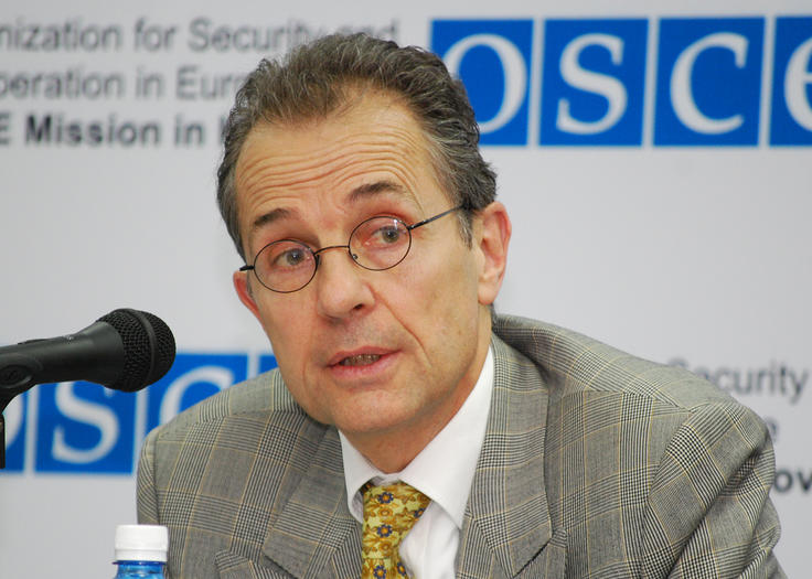 Ambassador Tim Guldimann, Head of the OSCE Mission in Kosovo, talks to the press at the release of an OSCE report on privatization in Kosovo, Prishtine/Pristina, 21 May 2008.