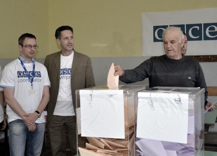 A voter casts his ballot in the Serbian parliamentary and presidential elections at an OSCE-run polling station in Gracanica/Graçanicë, 6 May 2012.