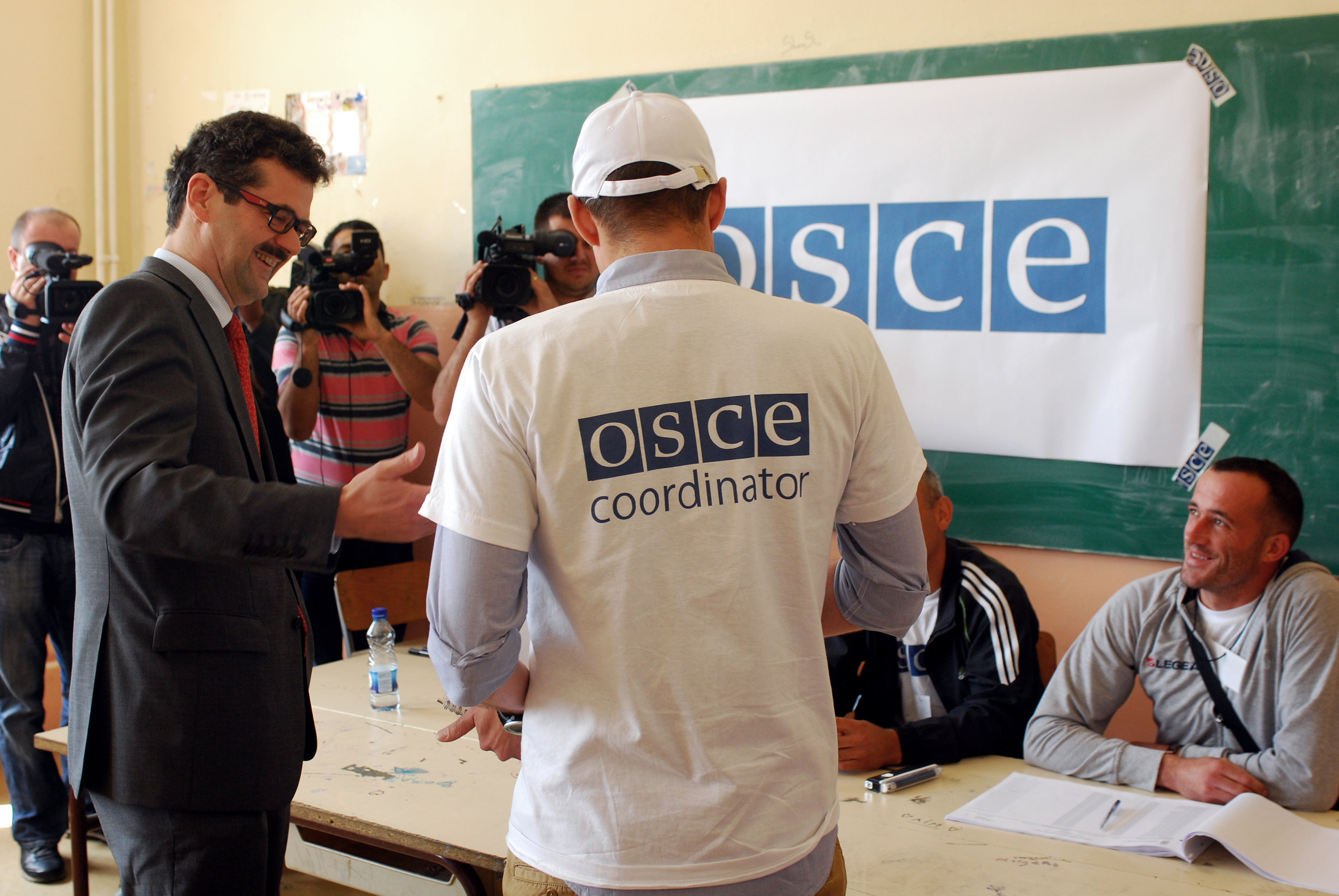 Head of the OSCE Mission in Kosovo, Ambassador Werner Almhofer, visits an OSCE-run ballot facilitation centre in Gracanica/Graçanicë, 20 May 2012.