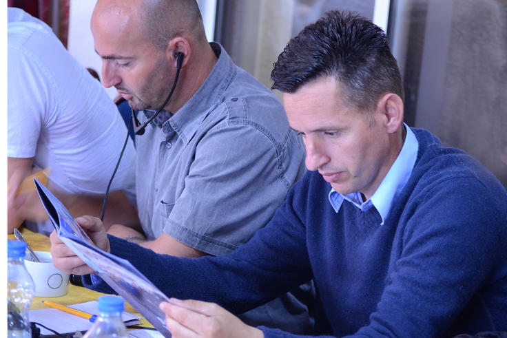 A Local Public Safety Committees (LPSCs) representative reads the Kosovo Police Protector magazine at the 8th executive council meeting of the LPSCs in Laplje Selo/Lapllasellë, a Serb village about four kilometres south-east of Prishtinë/Priština, 6 June 2012.
