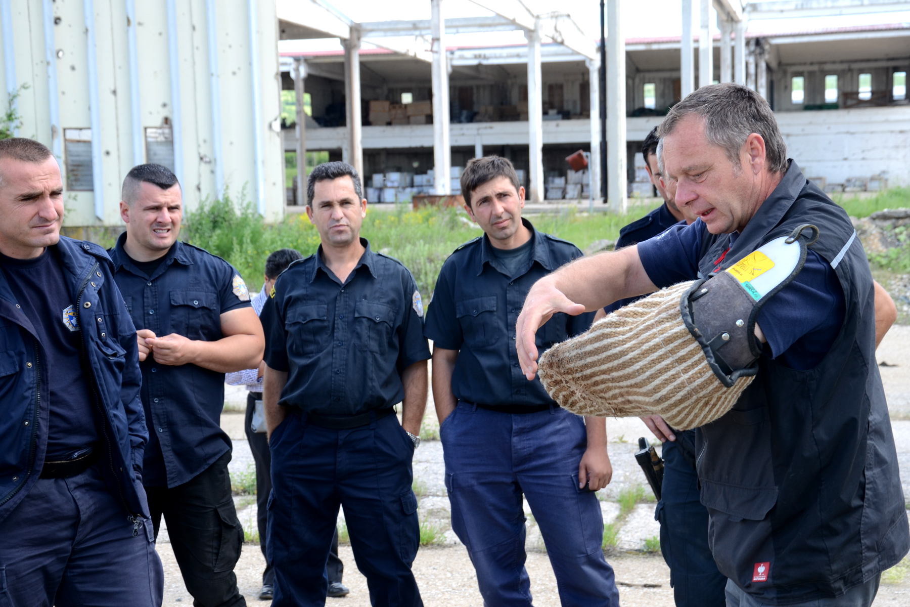 An Austrian expert Berthold Gasser, in an outdoor session, explains to the Kosovo police dog handlers how to train and handle detection dogs in searching narcotics and explosives during a two-week training organised by the OSCE Mission in Kosovo, Leban/Lebane, 06 June 2012.