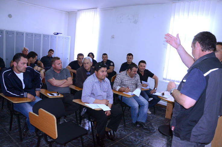 An Austrian expert Berthold Gasser (r), during a training session, explains to the Kosovo police dog handlers how to train and handle a detection dogs in searching narcotics and explosives during a two-week training organised by the OSCE Mission in Kosovo, Leban/Lebane, 06 June 2012