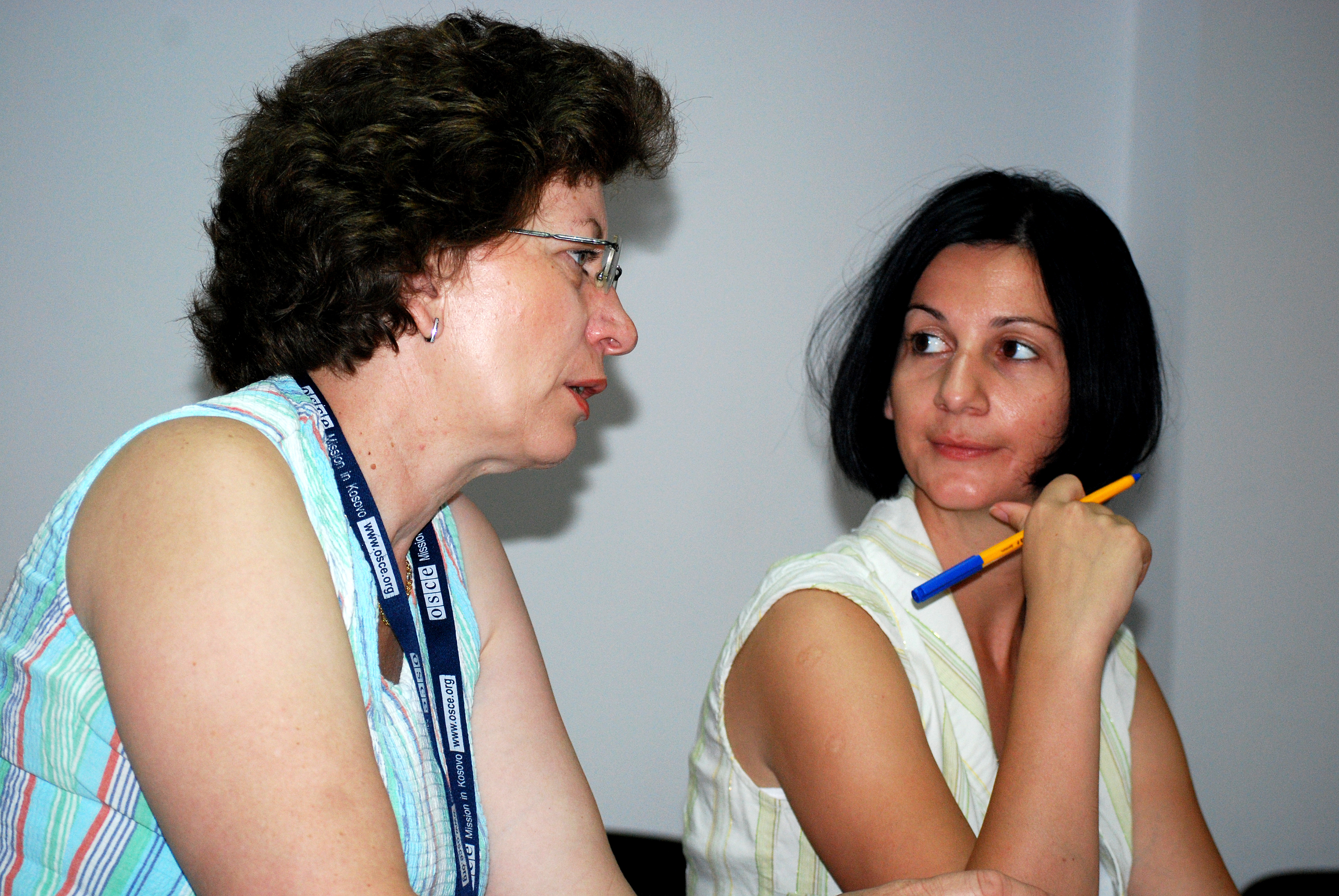 Sanije Haziri (left) from the OSCE municipal team covering Lipjan/Lipjan and Bernedett Csapo from the municipal team covering Prishtine/Pristina municipality welcomes participants in an OSCE workshop on gender equality, Prishtine/Pristina, 25 June 2008.