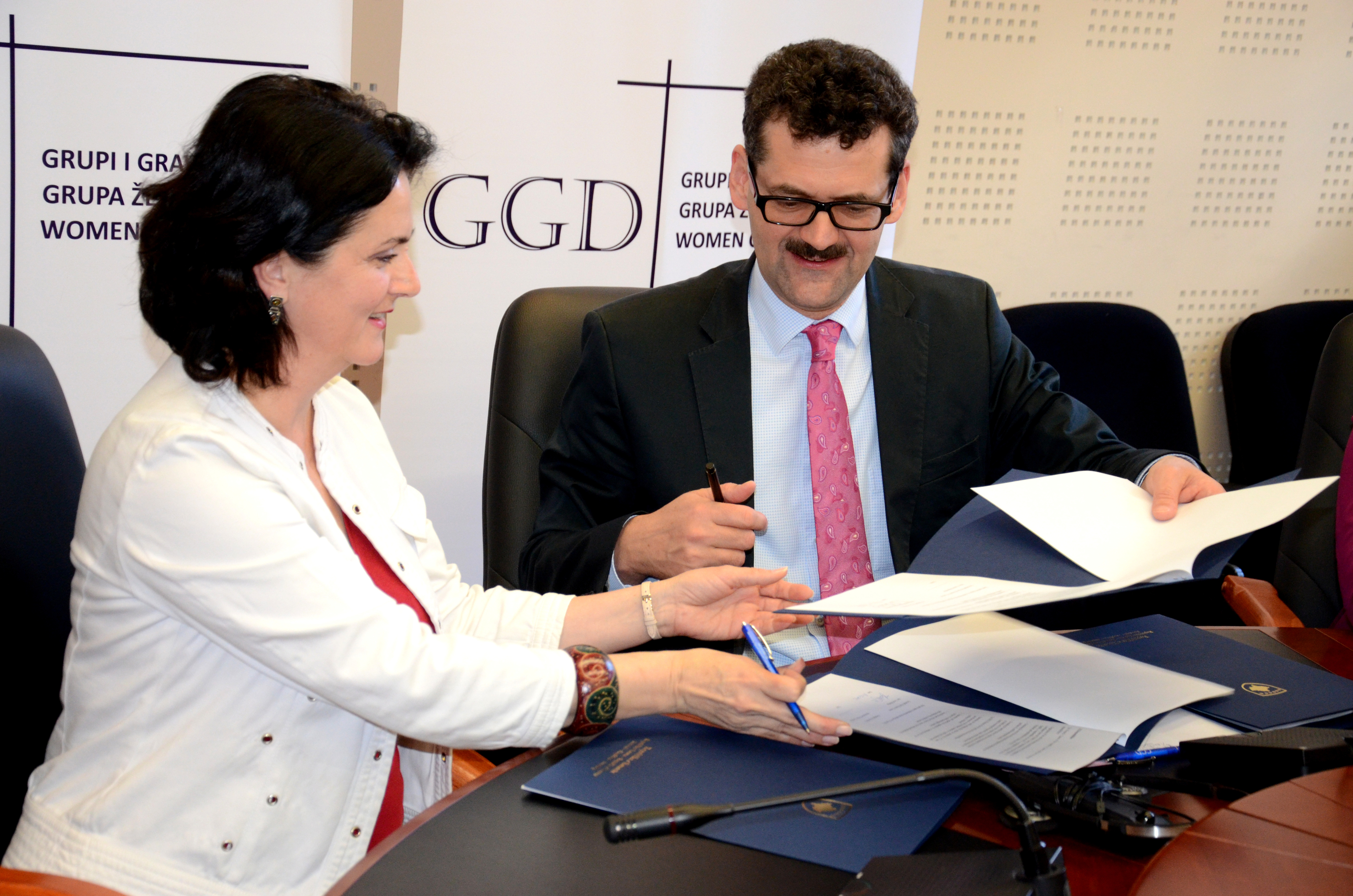 The Head of the OSCE Mission in Kosovo Ambassador Werner Almhofer (r) and the Chairperson of the Assembly of Kosovo Women Caucus, Teuta Sahatqija, during the signing ceremony of an agreement on co-operation, Prishtinë/Priština, 14 June 2012.