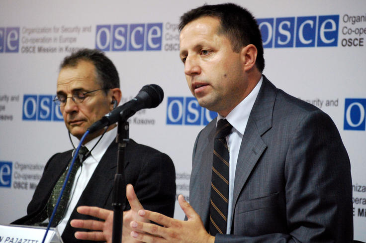 Internal Affairs Minister Zenun Pajaziti (left) and OSCE Kosovo Mission Head Tim Guldimann talk to the press about the Mission's report on public trust in Kosovo's public safety institutions, Prishtine/Pristina, 30 June 2008.
