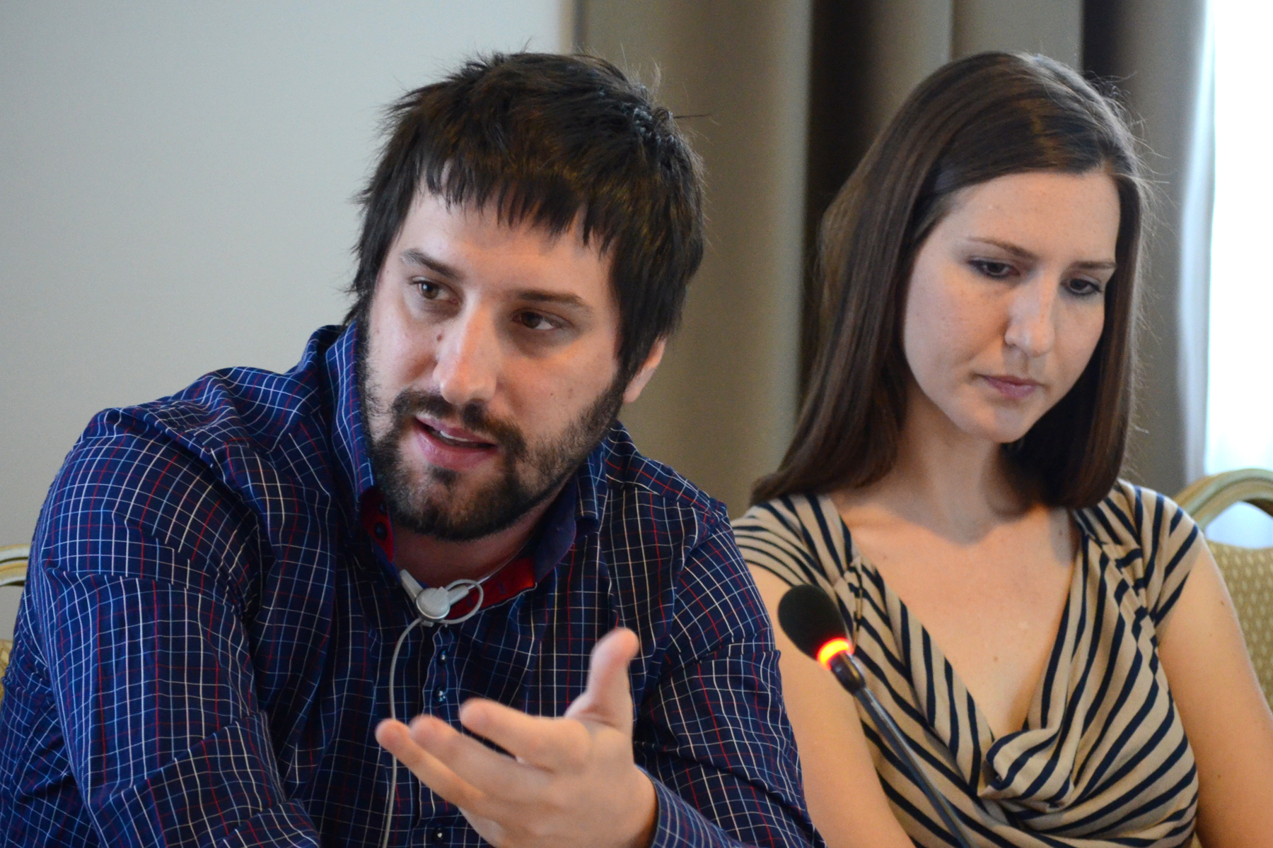 Vukasin Grozdanović (l) from the National Youth Council of Serbia speaks a regional conference on youth participation in policy making organized by the OSCE Mission in Kosovo and Kosovo’s Central Youth Action Council, Prishtinë/Priština, 9 July 2012.