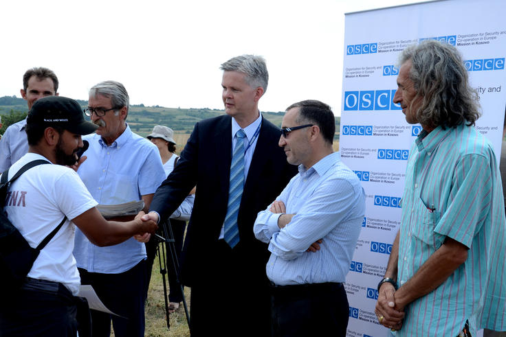 Acting Director of the OSCE Mission’s Department of Human Rights and Communities, Hjortur Sverrisson congratulates one of the students taking part in a multi-ethnic archaeological youth camp supported by the OSCE Mission in Kosovo, at the Ulpiana site, 27 July 2012.